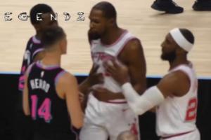 距離首節(jié)結(jié)束還剩5分鐘時,熱火就開始包夾杜蘭特,希羅這時候就開始噴垃圾話。