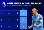 現(xiàn)在,當(dāng)賽季進入尾聲時,只有六場比賽凈勝四球或以上,這并不正常。事實上,與過去10個賽季相比,這一數(shù)字明顯較低。上賽季28輪比賽后,有21場比賽凈勝四球或以上。2023-24賽季28輪比賽后,也有21場比賽凈勝四球或以上。自2016-17賽季以來,此前最低的記錄是2019-20賽季的15場。