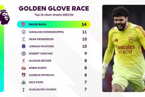 英超金手套獎最新排名: