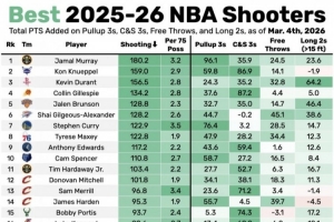 衡量參數(shù)(最后四列)依次為急停三分、接球就投三分、罰球和長(zhǎng)兩分總評(píng)分