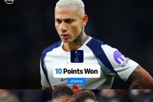 據(jù)媒體統(tǒng)計,熱刺本賽季主場僅拿到10分,在英格蘭前四級別聯(lián)賽的92支球隊中,只有謝周三本賽季的主場積分(9分)少于熱刺。