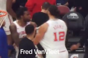 昨日第三節(jié)結(jié)束,伊森和亞當(dāng)斯有些沖突,互相拉拽球衣,火箭助教迅速介入拉開雙方?;鸺渌騿T也有些懵……
