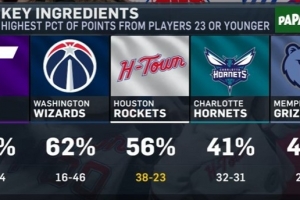 火箭主場(chǎng)迎戰(zhàn)開(kāi)拓者,轉(zhuǎn)播方曬出本賽季23歲及以下球員得分占球隊(duì)總分比重最高的五支球隊(duì),分別是: