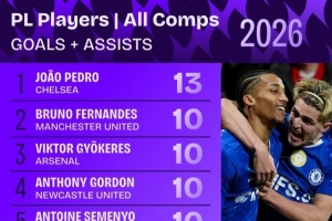 體育資訊3月8日訊 Squawka統(tǒng)計(jì)了2026年英超球員各賽事參與進(jìn)球數(shù)量,并列出榜單,若昂·佩德羅參與13球居首,B費(fèi)、約克雷斯、戈登、塞梅尼奧參與10球。