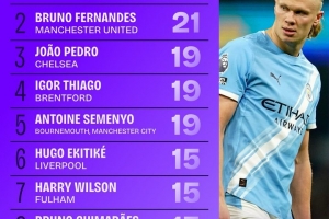 體育資訊3月10日訊 Squawka統(tǒng)計了本賽季英超的參與進(jìn)球榜(進(jìn)球+助攻),哈蘭德位列第一。