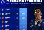 德轉(zhuǎn)發(fā)布英超U21球員最新的身價(jià)榜,切爾西的埃斯特旺位列第一。以下是具體排名,包括姓名,年齡,身價(jià)(變動(dòng)幅度)。