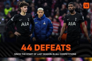 據(jù)LiveScore統(tǒng)計(jì),上賽季以來熱刺各賽事輸?shù)?4場(chǎng)比賽,與阿森納近5個(gè)賽季(2021年8月份以來)輸?shù)舻谋荣悎?chǎng)次相同。