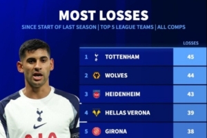 體育資訊3月11日訊 根據(jù)德轉(zhuǎn)統(tǒng)計,熱刺是上賽季以來五大聯(lián)賽輸球最多的球隊,各項賽事一共輸?shù)?5場。