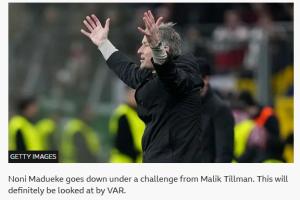 在BBC的直播間中,對(duì)這個(gè)點(diǎn)球的判罰描述為:馬杜埃凱在與蒂爾曼的對(duì)抗中倒地,這肯定會(huì)由視頻裁判進(jìn)行審查。英格蘭邊鋒幾乎沒(méi)受到任何接觸,但判罰維持不變。