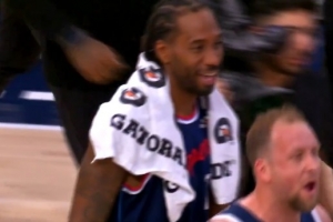 比賽結(jié)束后,兩隊(duì)爆發(fā)沖突,正在與對(duì)手擁抱致意的倫納德對(duì)著旁邊的裁判喊了句:they fighting (看,他們?cè)诖蚣埽S后微微一笑。