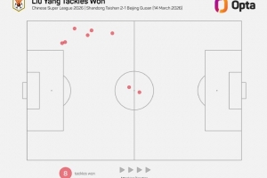 8 - 劉洋本場比賽有8次成功搶斷,刷新自2012年Opta采集相關(guān)數(shù)據(jù)以來,山東泰山球員單場中超新高。