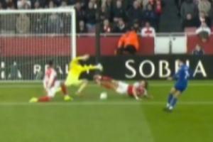 比賽第17分鐘,恩迪亞耶的傳中被拉亞撲了一下,麥克尼爾門前的近距離補(bǔ)射被已經(jīng)倒地的卡拉菲奧里用一個(gè)非常奇怪的姿勢極限封堵了出來!