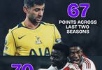 本賽季熱刺英超29輪只拿到29分(7勝8平14負(fù)),上賽季聯(lián)賽38輪他們也只拿到了38分(11勝5平22負(fù)),最終更是僅僅排名積分榜的第17位。