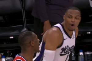 比賽最后時(shí)刻,威少與快船后衛(wèi)克里斯·鄧恩爆發(fā)口角,威少怒噴道:“你TM就是個(gè)無名小卒、無名小卒。你是誰?來試試?你根本不敢。滾回去吧(此時(shí)鄧恩被換下),你TM在說什么?”