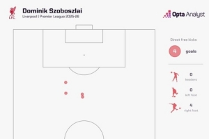 索博斯洛伊本賽季在英超聯(lián)賽中已經(jīng)直接通過任意球打入四球。此前,貝克漢姆(2000-01賽季)和勞倫特·羅伯特(2001-02賽季)在一個(gè)英超賽季中通過任意球打入五球。