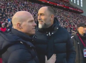 轉(zhuǎn)播鏡頭顯示,比賽開始前,圖多爾出現(xiàn)在安菲爾德場邊,他走向一個穿著深色外套,雙臂交叉的人面前,拍了拍他的肩膀,打招呼并與他握手——可能認(rèn)為對方是斯洛特。