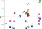 直播吧3月16日訊 今天,數(shù)據(jù)媒體用圖表的方式展現(xiàn)了NBA歷史上各隊(duì)的勝率(縱軸)及比賽總場次(橫軸)。