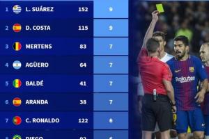 體育資訊03月16日訊 德轉盤點前10聯(lián)賽中,球員在各項賽事假摔染黃次數(shù)榜,蘇亞雷斯和迭戈·科斯塔9黃并列第一,C羅6黃上榜。