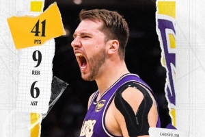 賽后湖人發(fā)布東契奇本場數(shù)據(jù)海報:賽季第四次砍下40+!四次40+也是聯(lián)盟本賽季最多的。