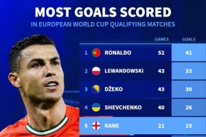 體育資訊11月17日訊 德國轉會市場列出了歐洲世預賽歷史射手榜,C羅41球居首,萊萬33球次席,哈蘭德21球排在第7位。