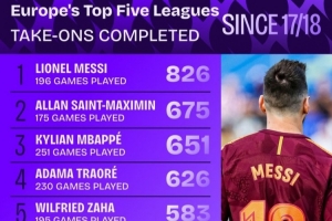 體育資訊11月19日訊 Squawka統(tǒng)計(jì)自17-18賽季以來,五大聯(lián)賽球員成功過人次數(shù),梅西以826次居首,圣馬克西曼、姆巴佩排在二三位。