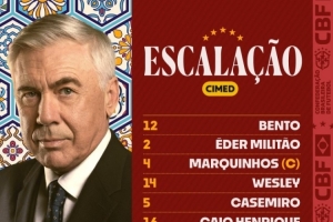 12-本托、2-米利唐、4-馬爾基尼奧斯、14-韋斯利、5-卡塞米羅、16-卡伊奧·恩里克、8-吉馬良斯、21-庫(kù)尼亞、20-埃斯特旺、10-羅德里戈、7-維尼修斯