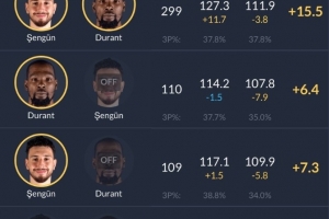 杜蘭特和申京同場時(shí),火箭進(jìn)攻效率127.3,防守效率111.9,凈效率+15.5;