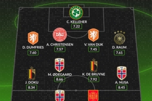 中場:多庫(比利時(shí),8.34分)、厄德高(挪威,8.66分)、德布勞內(nèi)(比利時(shí),7.92分)、安東尼奧·努薩(挪威,8.45分)