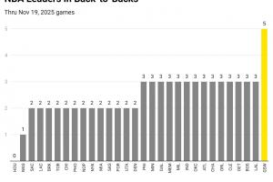 上圖為雅虎記者制作的賽季至今聯(lián)盟的背靠背數(shù)量統(tǒng)計,火箭0個,其他球隊都是2個或者3個,勇士5個;