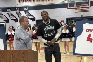 體育資訊11月21日訊 昨日,太陽后衛(wèi)杰倫·格林的高中球衣退役儀式在圣華金紀念高中舉行。
