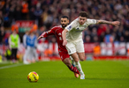 諾丁漢森林隊球員威廉斯(右)與利物浦隊球員薩拉赫在比賽中拼搶