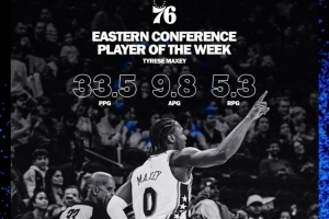 上周馬克西率領76人取得3勝1負的戰(zhàn)績,場均轟下33.5分5.3籃板9.8助攻。