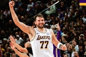 賽后湖人官方發(fā)布贏球海報,封面為東契奇舉手慶祝瞬間。