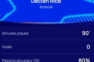 本場(chǎng)比賽賴斯發(fā)揮出色,傳球成功率80%,跑動(dòng)覆蓋11.9km,賽后他當(dāng)選歐冠官方評(píng)選出的本場(chǎng)最佳球員。