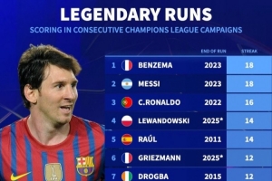 體育資訊11月27日訊 《轉(zhuǎn)會市場》統(tǒng)計了歐冠歷史賽季連續(xù)進球情況,梅西和本澤馬并列居首。