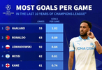在這份榜單中,效力于曼城的哈蘭德以53場打進(jìn)54球,場均1.02球位列第一,是近十年歐冠賽場上唯一一位場均進(jìn)球破一的球員。C羅以場均0.89球排名第二,萊萬0.84球第三,梅西0.81球緊隨其后,名列第四,凱恩則以0.74球位居第五。