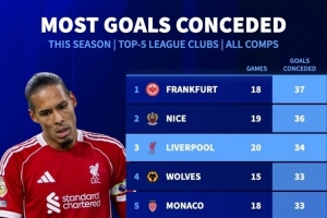 體育資訊11月27日訊 德國轉(zhuǎn)會(huì)市場(chǎng)統(tǒng)計(jì)了本賽季五大聯(lián)賽球隊(duì)的失球數(shù)量,并列出榜單,法蘭克福丟37球最多,利物浦丟34球第三。