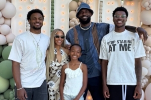 湖人前鋒詹姆斯的小兒子布萊斯更新Instagram Story,曬出一張詹姆斯全家四口的合影,并寫道:“感恩??”
