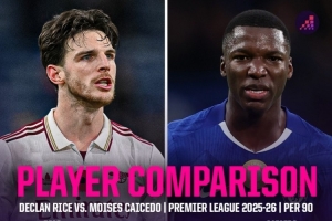 體育資訊11月28日訊 北京時(shí)間12月1日凌晨,切爾西將在英超第13輪比賽中主場(chǎng)對(duì)陣阿森納,Opta對(duì)比了賴斯和凱塞多本賽季英超的數(shù)據(jù)。