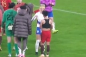 賽后,中國女足球員張琳艷和英格蘭女足中場凱莉現(xiàn)場交換球衣。