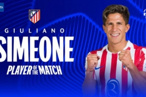 此役朱利亞諾-西蒙尼為馬競首發(fā)出戰(zhàn),助攻阿爾瓦雷斯破門,他當(dāng)選本場比賽歐冠官方全場最佳球員。