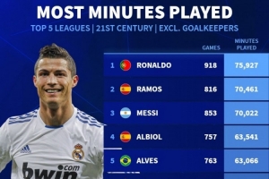 體育資訊12月5日訊 德國(guó)轉(zhuǎn)會(huì)市場(chǎng)統(tǒng)計(jì)了21世紀(jì)非門將球員在五大聯(lián)賽的出場(chǎng)時(shí)間,并列出榜單,C羅居首,拉莫斯、梅西二三位。