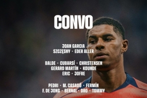 體育資訊12月6日訊 北京時間明天凌晨1點(diǎn)30分,巴薩將在西甲第15輪比賽中客場對陣貝蒂斯,巴薩公布了此役的球員名單,費(fèi)爾明、德容回歸,奧爾莫、阿勞霍、加維缺席。