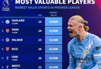 北京時(shí)間12月9日,在更新了英超球員的身價(jià)之后,德轉(zhuǎn)列出了目前英超身價(jià)排名前10的球員。此次身價(jià)上漲2000萬(wàn)歐元,目前身價(jià)達(dá)到2億歐元的哈蘭德高居第一,薩卡身價(jià)雖然下跌1000萬(wàn)歐元,但仍以1.3億歐元排名第二,帕爾默、賴斯以及伊薩克同以1.2億歐元并列第三。