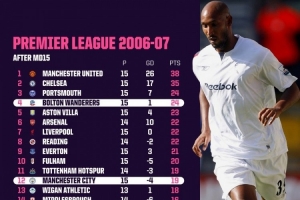 06-07賽季英超第15輪結(jié)束后積分榜: