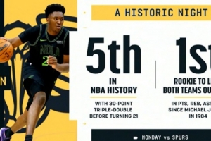 第5位21歲前砍下30+三雙的球員,比肩詹姆斯、東契奇、文班和福克斯