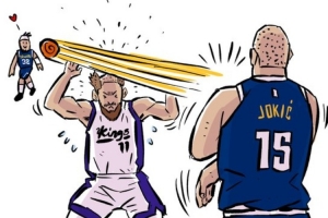 體育資訊11月6日訊 在之前掘金對(duì)陣國(guó)王的比賽中,約基奇貼著多曼塔斯·薩博尼斯頭皮傳球的一幕,被漫畫家Jay Kim創(chuàng)作出一幅搞笑漫畫。