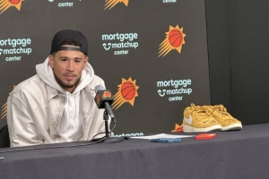賽后,布克帶著庫(kù)里賽前熱身親穿的Book1球鞋(布克的簽名球鞋)參加了新聞發(fā)布會(huì)。鞋子的上面有庫(kù)里的親筆簽名及寄語(yǔ)。