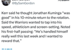科爾表示,他認(rèn)為庫明加在回歸輪換陣容的10分鐘里表現(xiàn)“不錯”。他說勇士隊希望利用他的速度、運動能力和擋拆能力??茽栠€特別提到了他上半場的傳球:“他過去一周的表現(xiàn)非常出色,我想給他一些獎勵?!?/p>