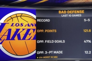 湖人過去10場5勝5負(fù),場均失分121.6分(聯(lián)盟第六差),對手投籃命中率47%,對手場均命中12.2個(gè)三分。